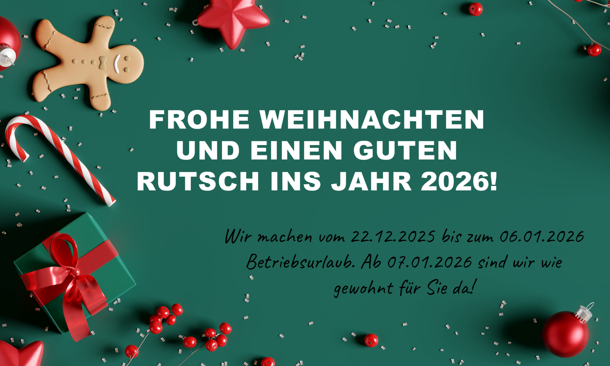 Für unseren Betriebsurlaub über die Weihnachtsfeiertage und den Jahreswechsel schließen wir unser Unternehmen. Wir sind vom 23.12.2025 bis einschließlich dem 06.01.2026 nicht im Haus. Ab dem 07.01.2026 sind wir wieder gewohnt für Sie da.