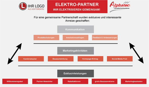 Die Grundidee ist, unsere bis jetzt schon langjährige und erfolgreiche Partnerschaft weiter auszubauen. Es soll ein kontinuierlicher, regelmäßiger und dabei zielführender Austausch zwischen Hersteller und Elektro-Partner entstehen. Zudem sollen natürlich beidseitige Leistungen die Verbindung interessanter gestalten. In der Partner-Pyramide sind die Details zur Partnerschaft in kürze zusammengefasst. Wir denken, wir haben interessante Anreize für eine solche Verbindung geschaffen.