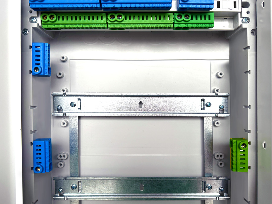 Die neue Einbauwanne und Montageplatten aus Kunststoff bieten überall Platz für zusätzliche Steckklemmen. Die Wanne ist außerdem separat verpackt, wodurch man je nach Bauabschnitt die richtigen Montageteile zur Hand hat. Vergessen Sie nicht, dass jeder Kleinverteiler schon fertig bestückt und verdrahtet ausgeliefert werden kann. Dies erspart Ihnen nicht nur eine Menge Arbeit, sondern auch enorm viel Zeit.
